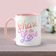 Die Kaffee-Tasse enthält den Satz "Die Liebe teilen" in rosa Farbverlaufsskript.