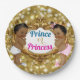 Adorable African Prince mit einer Goldkrone und einem weißen Windeln mit blauen Hausschuhen und einer wunderschönen afrikanischen Prinzessin, die einen rosa gepanzerten Windeln mit Goldkrone trägt, und rosafarbene Hausschuhe auf einem goldenen Rahmen auf goldenem Glitzer ©Miss Sassy Party Designs