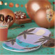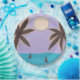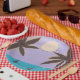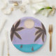 Diese Teller sind mit einer Zeichnung aus Papier entworfen, die silhouetted Palmen gegenüber einem Lavendelhimmel über einem türkisfarbenen Ozean darstellt.
