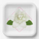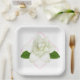 Die Papiertafel aus Party wird in Weiß mit einem Kunstdruck einer hübschen Gärtnerei-Blume gezeigt. Passende Papierservietten sind erhältlich. Passen Sie dieses Objekt an oder kaufen Sie, wie es ist. Bild