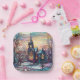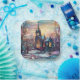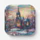 Ein charmantes Set aus quadratischen Tellern mit dem Bild einer Winterkirche im Buntglasstil.