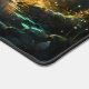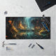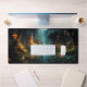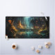 Un temple se trouve au milieu d'une forêt turquoise magique sous la lumière d'une pleine lune. Un pont voisin enjambe une petite rivière qui traverse la scène et de minuscules lumières jaunes scintillent autour de la fleur orange et des feuilles.