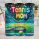 Dieses farbenfrohe und fröhliche Bild zeigt einen Tennisplatz bei Nacht unter hellen Lampen des Stadions und einen sternförmigen, bewölkten Himmel. Die Worte "Tennis-MAMA" werden in großen, leuchtenden, neonähnlichen Buchstaben über dem Platz angezeigt. Ein Tennisschläger und mehrere Tennisbälle sind auf dem grünen Platz verteilt, mit einem sichtbaren Netz im Hintergrund und Zuschauer in den Ständen, die die unterstützende Rolle einer Tennismutter feiern.
