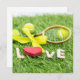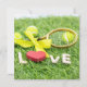 Tennisball und Schläger auf grünem Gras mit Liebe-Flachkarte