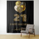 Une tapisserie pour une soirée glamour de 21ème anniversaire. Un arrière - plan noir, décoré de ballons. Avec le texte : Joyeux anniversaire. Personnalisez et ajoutez un nom. Le nom est écrit en or rose foncé avec un script de style moderne écrit à la main avec des swashes. Le numéro 21 est écrit avec une police de style ballon tendance, motif léopard. Pour que les swashes ne suppriment que le nom de l'échantillon, laissez les espaces ou émoticônes devant et après le nom. Peut être utilisé comme bannière de bienvenue, décoration murale pour la fête ou comme fond de cabine photo.