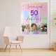 Pour une fête d'anniversaire de 50 ans. Un collage de 3 de vos photos d'elle, d'amis, de famille, d'intérêts ou d'animaux de compagnie. Un fond holographique couleur arc-en-ciel en violet, rose, or rose et vert menthe. Décoré de fausses gouttes de paillettes et du mot : Fabuleux. Personnalisez et ajoutez son nom et son âge 50 ans. Le nom est écrit avec un style de lettrage manuscrit tendance. Texte de couleur violette. Parfait pour une fête surprise ! Utilisez comme bannière de bienvenue, décoration murale ou comme toile de fond pour photomaton.