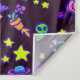 Une jolie scène spatiale remplie d'étoiles jaunes, de planètes colorées et de personnages adorables. Un alien vert avec des chaussures à fusée, une fleur alien dans un pot à fleurs, une voiture-fusée futuriste rétro avec une dame et son chat, et une soucoupe volante avec un alien heureux qui lui arrache les yeux. Avec MLO, la signature des artistes, cachée sous les planètes.