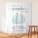 Sympathique panneau d'accueil de la tapisserie bébé garçon et accessoires photo avec une aquarelle bleu pastel et "A Sweet Little Citrouille Is On His Way" écrit dans un mélange de typographie grise et un script élégant avec des swashes. Personnalisez avec le nom de la future mère et la date de la douche.