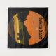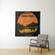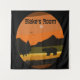 Black Bear silhouette tapestry with earth tone colors on background. Mountains, trees, birds, and sun with a black bear on this outdoorsy, wildlife design with personalized name.