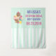 Tapisserie retour pour un baby shower ou un autre événement. Illustré avec un bol de crème glacée avec 3 succulentes boules couvertes de bonbons saupoudrés. Un cône glacé également avec 3 boulettes de chocolat, vanille et fraise. Un bol de desserts rempli de crème glacée au goût néopolite avec une délicieuse cerise sur le dessus. Un motif à rayures vertes et blanches dans l'arrière - plan.