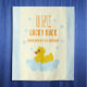 Un canard chanceux ! Premier anniversaire avec canard en caoutchouc et bulles contre un en vichy bleu clair et arrière - plan jaune pâle avec texte orange