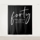 Tapisserie de soirée noire chic de 40ème anniversaire, signe de bienvenue et accessoires photo avec "quarante" présenté dans un script blanc élégant et votre nom et la date en lettres blanches modernes.