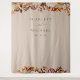 Cette élégante tapisserie de mariage | photo arrière - plan stand avec aquarelle peinte à la main feuilles d'orange brûlé et de terre cuite, dahlias crème et beige, et de beaux roses couleur rouille sur un arrière - plan taupe avec les noms de la mariée et du marié et la date mariage. Trouvez les articles correspondants dans la collection Taupe Autumn Romance.