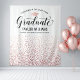 Élégant fond pour fête de diplômé pour photos présente une casquette de grad couleur rose gold, "Diplômé" en écriture cursive, et un texte personnalisé moderne qui peut être personnalisé avec le nom du diplômé et de l'école. Un motif de confettis en faux feuille de rose gold qui tombent habille le fond - accessoire de fête parfait pour que les invités se tiennent devant pour des photos avec le diplômé ! Plusieurs tailles sont disponibles.