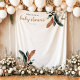 Cette bannière de tapisserie pour fête de bébé présente de la verdure et des plumes à l'aquarelle avec une police script amusante. Modifiez facilement *la plupart* du texte pour votre événement. Cette tapisserie est l'ajout parfait à votre événement rustique, neutre en termes de sexe, bohème ou sur le thème de la forêt.