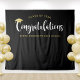 Grand fond de cérémonie ou de fête de fin d'études pour toutes les photos des diplômés ! Le design est minimaliste et présente une calligraphie moderne blanche « Félicitations » avec un accent de casquette de diplômé or sur fond noir. Personnalisez le texte avec l'année de promotion et le nom de l'école.