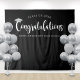 Grand rideau de fond pour cérémonie ou fête de fin d'études pour toutes les photos des diplômés ! Le design est minimaliste et présente un lettrage calligraphique moderne blanc « Félicitations » avec un accent de casquette de diplômé gris argent sur fond noir. Personnalisez le texte avec l'année de la promotion et le nom de l'école.