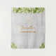 La guirlande de fleurs ancienne sur la bordure supérieure et les fleurs dans les coins inférieurs - lys blancs et petites fleurs blanches - proviennent d'une ancienne carte de vœux de Bertha Maguire (1862-1910), maintenant dans le domaine public. Le fond est en marbre blanc. Il y a une croix dorée au-dessus du texte. Le nom de l'enfant est écrit dans un élégant script calligraphique, le reste en majuscules. Tous les textes peuvent être personnalisés et ont une couleur jaune doré, semblable à la croix dorée.