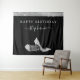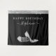 Tapisserie élégante et moderne argent et noir de fond de photo de joyeux anniversaire avec chaussures à talons aiguilles en strass et nom en écriture cursive personnalisé en noir et blanc.