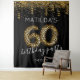 Fond de photobooth pour une fête d'anniversaire 60 ans amusante avec un fond noir tendance, paillettins dorés et confettis, 60 ballons en hélium à impression léopard, le nom de la fille/garçon du jour et la date.