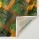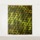 Estampado com imagine quadradas verde colocadas como se fossem tijolos em uma parede - inclinada -, onde as linhas amarelas ou douradas na volta das pequenas imagens podem parecer em alto pertinence ou o fundo composto imagem verde parece estar mais profundo que as linhas amarelo dourado pode parecer um tipo de grade. - Esta estampa tem as listras amarelas mais largas.