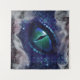 Oeil de dragon gothique mythique bleu médiéval avec encre violette et brouillard.