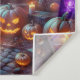 Carrousel fantôme Tapisserie d'Halloween Sous un ciel étoilé voilé dans la brume, un carrousel hanté tourne dans un silence sinistre. Les fantômes dérivent paresseusement dans l'air, leurs formes translucides brillant sur le fond d'arbres sans feuilles et de lanternes scintillantes. Les chauves-souris survolent, tissant à travers les ombres sous forme de gris-o-lanternes grinçant de chaque coin, jetant une lumière orange chaude à travers le sol pavé. Un motif circulaire gravé avant le carrousel évoque des rituels oubliés et des rassemblements spectraux. L'atmosphère est festive mais à l'avant-garde, un mélange surréaliste d'émerveillement d'enfance et de mystère surnaturel.