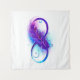 Infinity symbole with a beautiful feather painted in purple and blue bright colors on white background