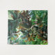 Photo de billets verts dans la forêt tropicale. Au premier plan, un immense Croton arboré de grands feuilles décoratifs lumineux.