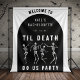 Définissez le ton d'une célébration à glacer le sang avec ce fond "Jusqu'à ce que la mort nous sépare". Le design présente des squelettes dansant à l'intérieur d'une arche de pierre tombale noire, donnant à votre soirée de célibataire une ambiance sombre et gothique. C’est parfait pour les séances photo, ajoutant une touche ludique mais sinistre à la décoration. Idéal pour les futures mariées qui adoptent des thèmes sombres, audacieux ou inspirés d'Halloween.