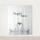 Deux beaux cygnes amoureux se courbent la tête et forment un coeur. Arrière - plan blanc élégant, parfait pour une maison moderne, un cadeau mariage ou pour un anniversaire mariage! Un couple de cygnes reste ensemble pour la vie, ils sont donc le symbole parfait de l'amour. Modèle pour deux noms, lettres noires. Peut également être utilisé comme bannière ou arrière - plan photo dans un anniversaire mariage/mariage.