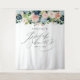 Cette élégante tenture de réception de mariage floral fait le fond parfait pour vos photos de douche. Le design chic présente des roses et de la verdure aquarelles rose pâle et bleu marine et bleu clair peintes à la main sur un fond blanc avec votre nom et les mots "Mariage Élégant" en typographie script moderne avec la date de votre douche pour personnaliser ci-dessous. Conçu par Susan Coffey.