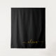 Tapisserie de nom de monogramme et initiale en écriture simple noire et or. Cela fait le cadeau parfait pour un anniversaire de 16 ans, un mariage, une douche de mariée, un anniversaire, une baby shower ou une soirée d'enterrement de vie de jeune fille pour quelqu'un qui aime le luxe et les styles chic.