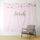 Avec les décors tendance et élégants que j'ai vus, avoir le nom du célébrant comme centre autour duquel vous pouvez décorer, crée une fête personnalisée. J'ai conçu cette tapisserie pour qu'elle soit simple avec des confettis dorés imprimés que votre décorateur pourra mettre en valeur avec des guirlandes de ballons, des lumières et d'autres idées amusantes. Les clients veulent parfois seulement un nom dans un script élégant pour leurs tables de gâteaux, j'espère que cela résoudra le problème de fond. Les couleurs sont personnalisables.