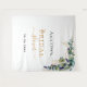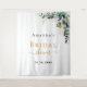 Un fond blanc chic. Décoré de feuilles d'eucalyptus aquarellées vertes, de brindilles, de verdure et de feuilles dorées. Personnalisez et ajoutez le nom de la future mariée et une date. Lettres noires et dorées. Peut être utilisé comme bannière de bienvenue pour une fête de mariage, comme décoration murale de fête ou comme toile de fond pour photobooth.