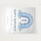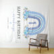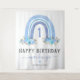 Tapisserie de premier anniversaire garçon bohème rustique avec un fond blanc simple, un arc-en-ciel bohème aquarelle mignon, des fleurs bleues élégantes et un modèle "joyeux anniversaire" moderne facile à personnaliser.