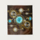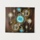 Turquoise lenses with antique watch with brass gears and golden keys on rusty, brown background. Steampunk style.