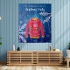 Une tapisserie pour une saison des fêtes amusante et des soirées de Noël, dîners. Un fond bleu avec de grands flocons de neige blancs, cristaux. Décoré avec un pull de Noël rouge, blanc, orange et vert laid. Personnalisez et ajoutez le nom de votre famille. Le texte : Soirée de Noël est écrit en blanc avec un style de lettre manuscrit moderne. Peut être utilisé comme un panneau de bienvenue, décoration murale de fête ou comme arrière-plan pour photomaton.