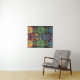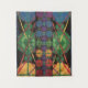 L'oeuvre de l'image est un design géométrique dynamique et complexe. Il présente une série de formes et de motifs interconnectés, principalement composés de cercles, de triangles et de lignes. Le design est symétrique et s'étend horizontalement sur un arrière - plan noir. Les cercles sont remplis de différentes couleurs, dont le violet, le bleu, le vert, le jaune et le rouge, créant un effet dégradé d'une extrémité à l'autre. Chaque cercle est entrelacé par des lignes formant des motifs étoiles, et les cercles sont reliés par un réseau de lignes qui créent un sentiment de profondeur et de complexité. L'ensemble est frappant visuellement, les couleurs vives contrastant fortement avec l'arrière - plan foncé, ce qui fait ressortir les motifs géométriques. Cette oeuvre est intéressante en raison de son utilisation de symétrie, de dégradés de couleurs et de travaux de ligne complexes, qui ensemble créent une expérience visuelle dynamique et attrayante.