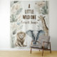 Un design minimaliste avec des animaux de bébé safari aquarelle et feuillage de jungle feuillu, accentué par un texte élégant pour un baby shower ou un premier anniversaire de sexe neutre.
