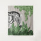 A solitary zebra walking amongst the monstera, ivy and bird of paradise leaves.