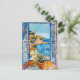 Illustrated view from terrace window overlooking harbor of a town at the Mediterranean Sea.