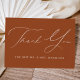 Elegante Hochzeit Dankeschön-Karte mit "Danke" in einem weißen kalligraphischen Skript mit Ihrem Nachnamen unten mit einem Terrakotta Hintergrund angezeigt. Die elegante Hochzeit Dankeschön-Karte kehrt um Ihre individuelle Danksagung und Vornamen in weißer Schrift anzuzeigen. Design koordiniert mit unserer Hochzeitskollektion "Moderne Elegance".