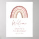 Bienvenue amis et famille à l'anniversaire de votre petit avec ce panneau d'accueil élégant rose et neutre à thème arc-en-ciel.