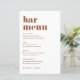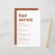 Ajoutez ce papier à lettres de carte à barres personnalisable à votre paysage de table d'évènement. Ils présentent une typographie rétro audacieuse et une typographie en terre cuite simple. Cette carte de menu du bar en terre cuite est parfaite pour les mariages, les douches nuptiales, les baby showers et bien plus encore.