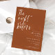 Minimalistische Hochzeitsdinner mit moderner Probe-Schriftart, in der "die Nacht vor" steht. Der Hintergrund ist terracotta braun.