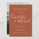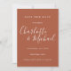 Diese elegante Terrakotta-Save the Date-Karte mit ihren charakteristischen Stilnamen kann mit Ihren besonderen Hochzeitstagsinformationen in schicker Typografie und Ihrem besonderen Foto auf der Rückseite personalisiert werden. Entwickelt von Thisisnotme©