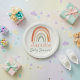 Set ein stilvolles Ambiente für Ihre Feier mit dieser schönen Babyduschplatte, die mit einem sanften, handgemalten Boho-Regenbogen in erdigen Pastelltönen über einer fröhlichen "Baby Shower!" und dem Namen des Babys besticht. Die warme, neutrale Farbgestaltung und der moderne, minimalistische Schriftart machen ihn zu einem idealen Ort für geschlechtsneutrale, rustikale oder zeitgenössische Themen. Dieses Design ist ein einladender Akzent für Ihren Party-Tisch und verbindet zeitlosen Charme mit schlichter Eleganz und sorgt für ein koordiniertes und unvergessliches Ambiente für jeden Gast.
