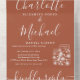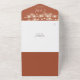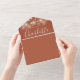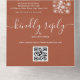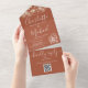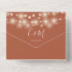 Alles in einer Hochzeitseinladung mit hübschen Saitenlichtern, Mauerkirschen, Signaturstil-Namen und schicke Typografie auf Terrakotta-Hintergrund. Die Einladung enthält eine perforierte RSVP-Karte mit QR-Code. Entwickelt von Thisisnotme©