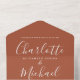 Alles in einer Hochzeitseinladung mit elegantem Schriftnamen und Monogramm-Initialen auf Terrakotta-Hintergrund. Die Einladung enthält eine perforierte RSVP-Karte mit Ihrem Hochzeitswebsite QR Code. Entwickelt von Thisisnotme©